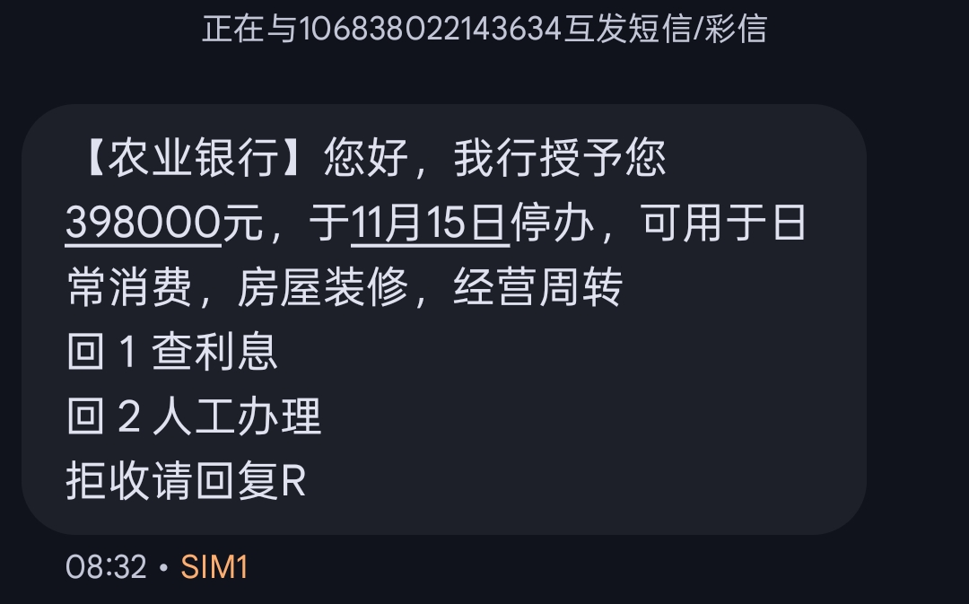 ②回复问题:诈骗短信只是简短的要求你回一回二,甚至拒收都要回复R,这种情况下千万不要回复,由于这些诈骗短信是广撒网模式,你回复就会让诈骗分子认为你这是个活跃的手机号,进而开展更深层次的诈骗。此外诈骗短信也没有预留中国农业银行的95599官方号码,就是为了防止你打电话询问后露馅。